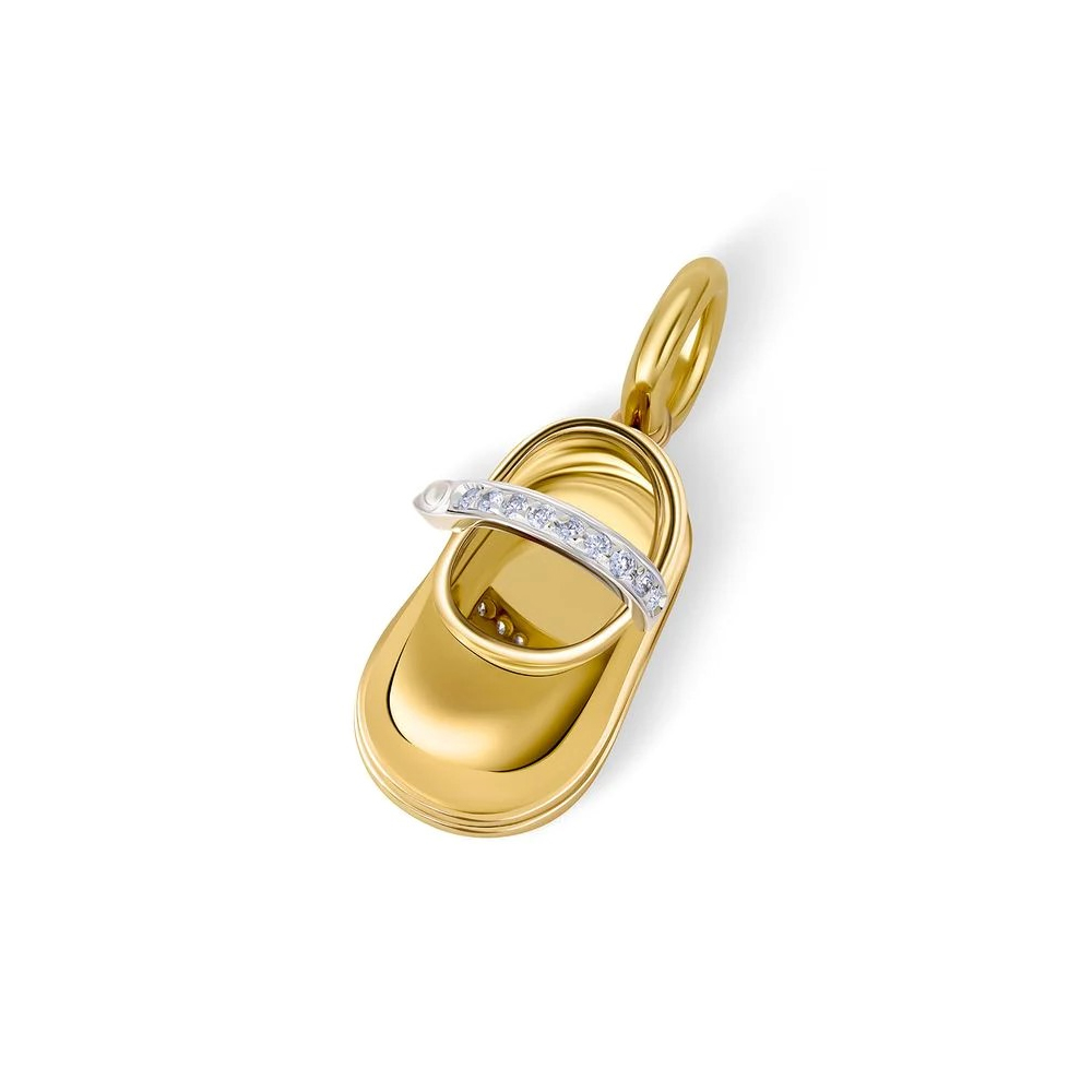 Celebra a la hermosa bebé de tu vida con un exclusivo dije de zapato de bebé, elaborado artesanalmente por Aaron Basha. Es la manera ideal de atesorar recuerdos especiales en una colección de joyas que durará toda la vida. Este clásico dije de alto brillo está adornado con una correa de zapato de oro blanco con diamantes.