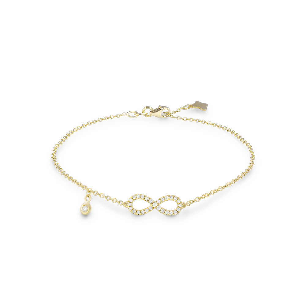 Pulsera elaborada en oro amarillo 18 k. con cierre de mosquetón ajustable. Muestra como motivo central el símbolo del infinito con brillantes engastados. Una pieza sencilla y refinada, versátil para uso diario o para destacar en momentos especiales.