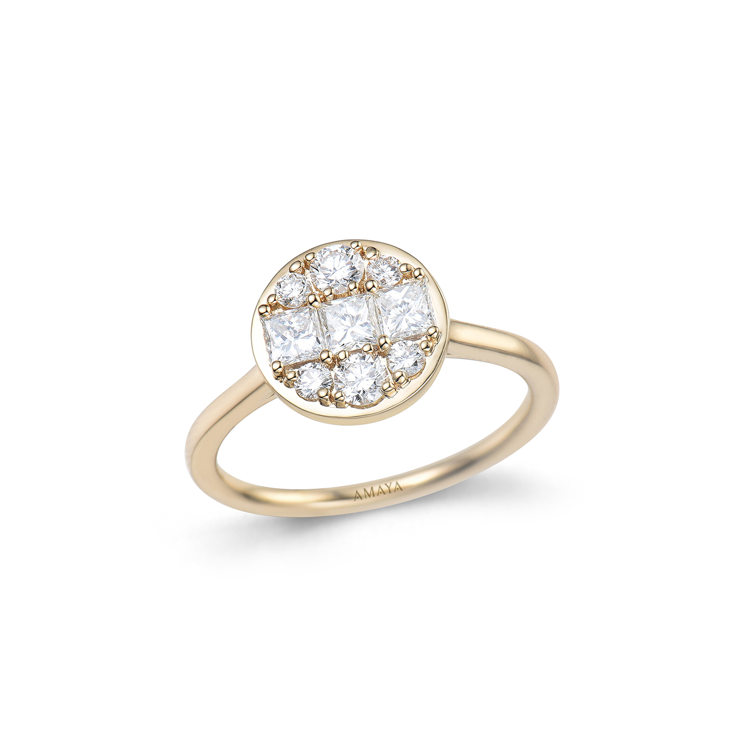 Sortija oro amarillo 18 k. con tres diamantes centrales talla princesa 0.51 cts. y seis diamantes talla brillante 0,32 cts. Este anillo es una pieza que combina la elegancia clásica con un diseño geométrico sofisticado, capturando el brillo de los diamantes en un montaje único.