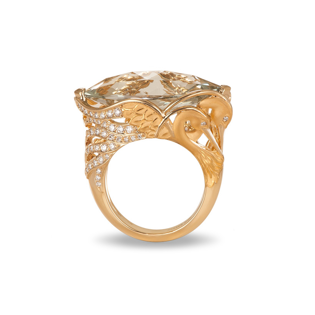 Este exquisita sortija Garzas, está elaborada en oro amarillo de 18 quilates, combinado con una prasiolita de 11,19 cts y 54 diamantes con un total de 0,44 cts. Este anillo destaca por la elegancia de la prasiolita y el brillo de los diamantes, convirtiéndolo en una pieza.