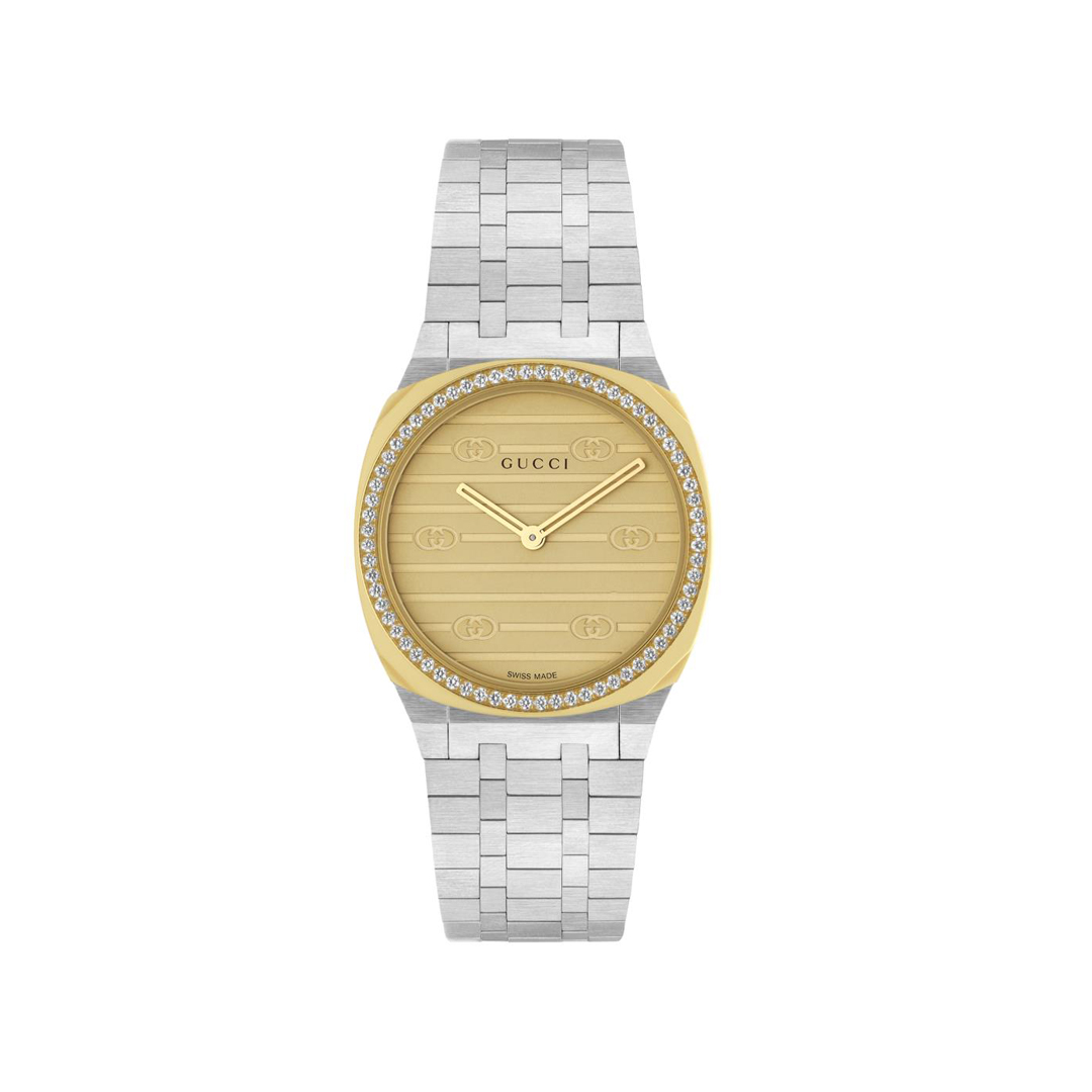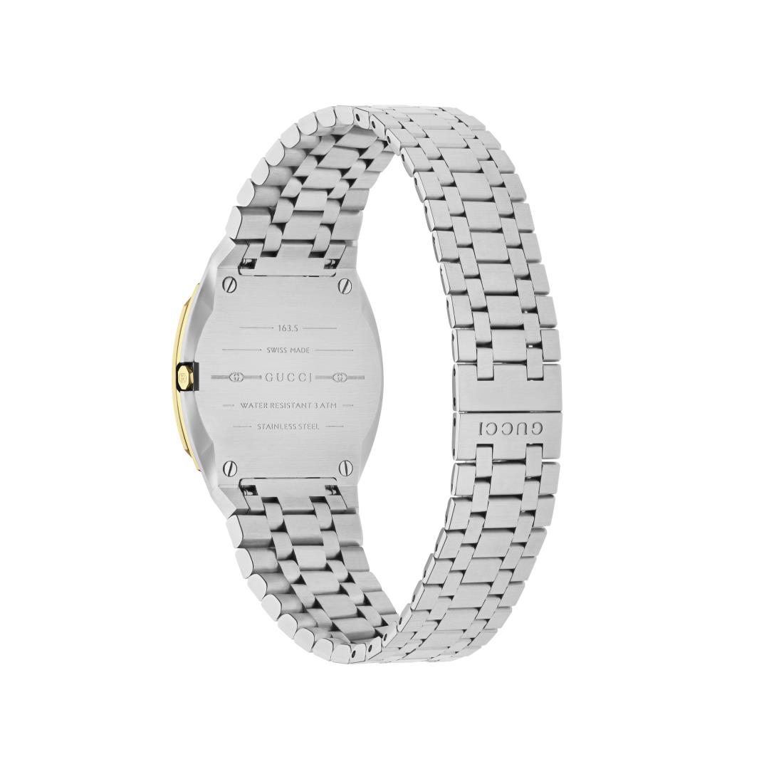 El diseño moderno del Gucci 25H es una declaración de la atención de Gucci a los detalles: una construcción de caja de tres capas combinada con una corona oculta para una forma elegante y un diseño ultradelgado para una segunda piel perfecta. Su estética urbana se inspira en el mundo arquitectónico y celebra aún más la iconicidad de Gucci.