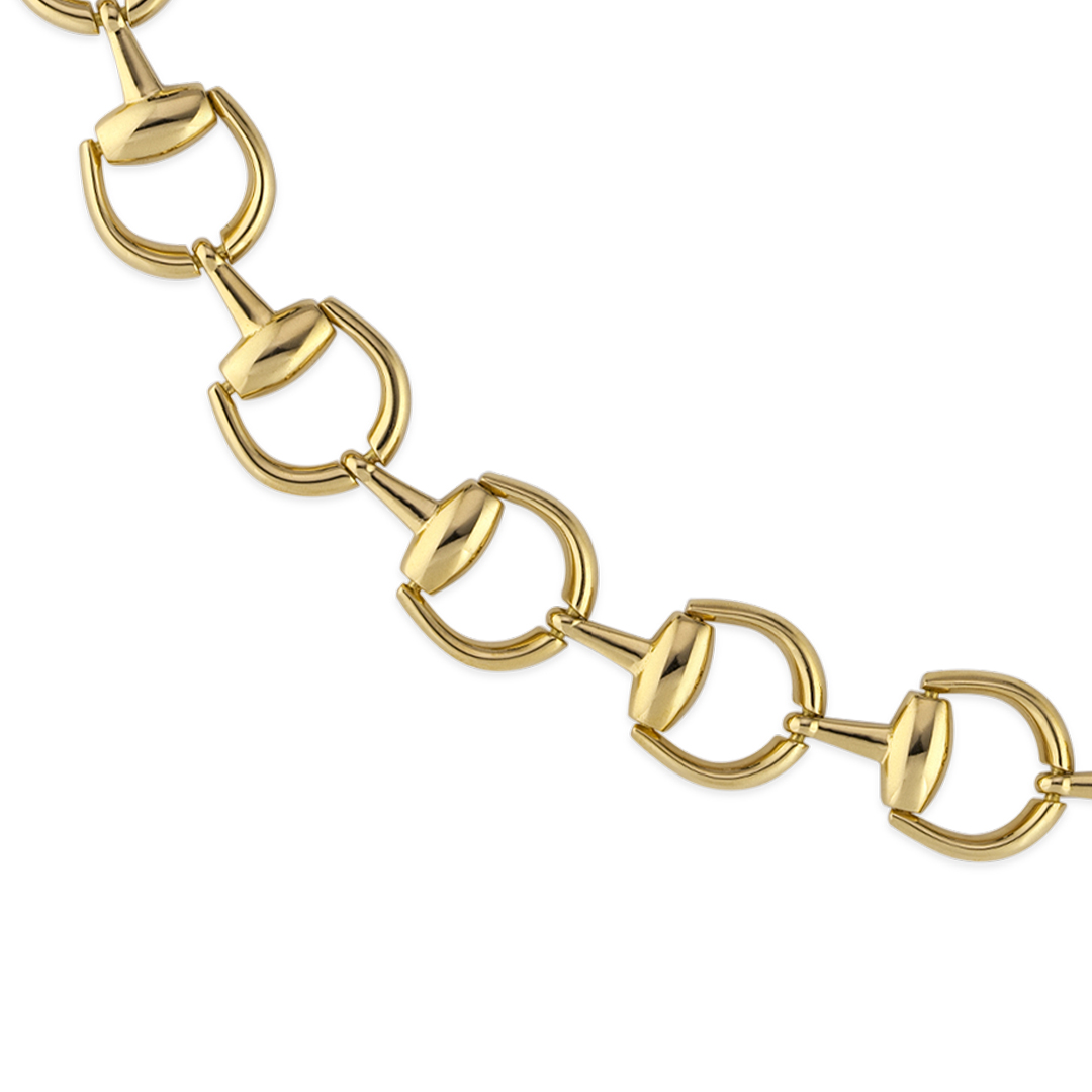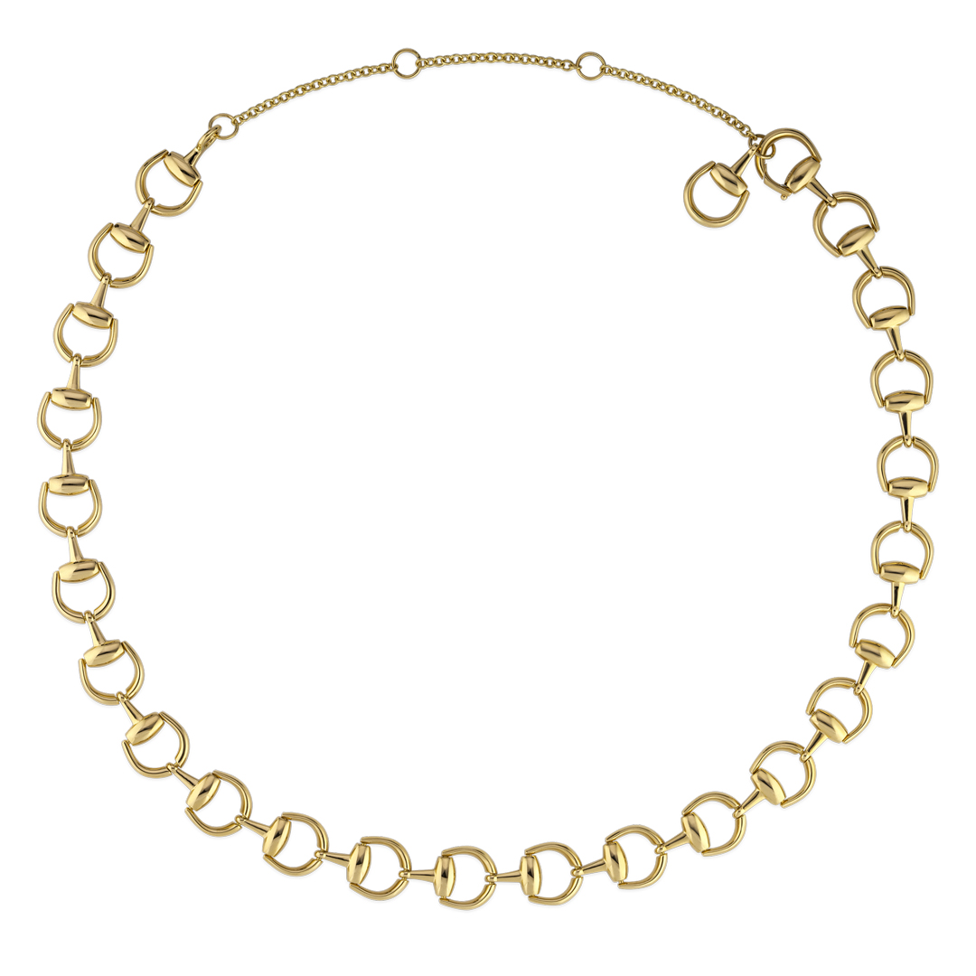 Gucci celebra el 20 aniversario de la exclusiva línea de joyas Horsebit con diseños clásicos y emblemáticos en oro amarillo de 18 quilates. Este collar de cadena se realza con un colgante de medio Horsebit.