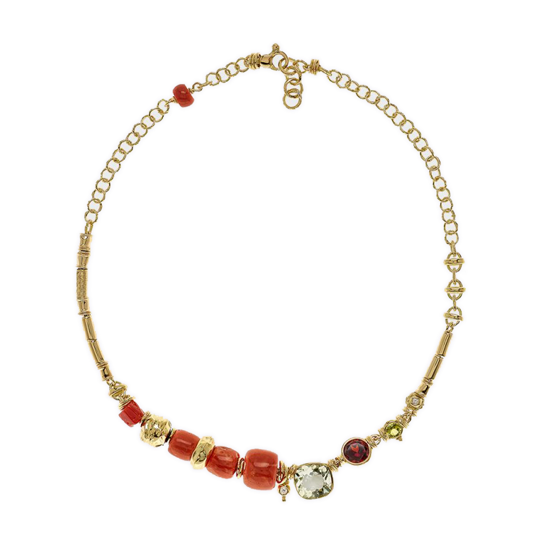 Coral, amatista verde, granate rojo, peridoto y diamantes |