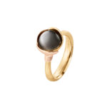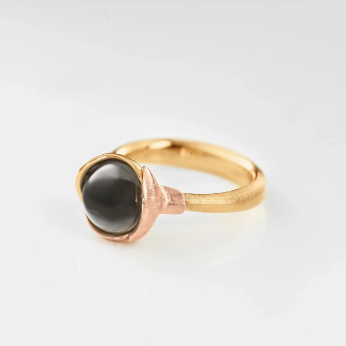 Diseñado por Charlotte Lynggaard, el anillo de loto, tamaño 1, está hecho de oro amarillo y rosa de 18 quilates con un cabujón de piedra Luna gris. Hecho a mano por maestros joyeros, las superficies doradas visibles están satinadas a mano, mientras que el interior del anillo tiene un acabado de pulido. Las piedras preciosas son materiales naturales, cada piedra es absolutamente única. Variarán en color y tendrán inclusiones y características individuales y únicas.