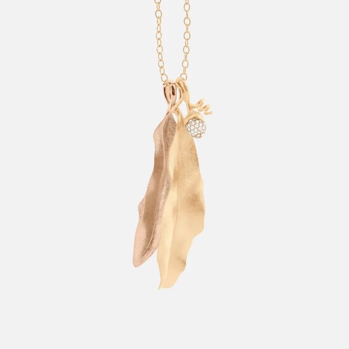 Diseñado por Charlotte Lynggaard, el colgante Leaves de 7 cm está hecho de oro amarillo de 18 quilates. Usando varias técnicas y herramientas diferentes, los maestros joyeros esculpen y terminan la superficie de la delicada hoja a mano.