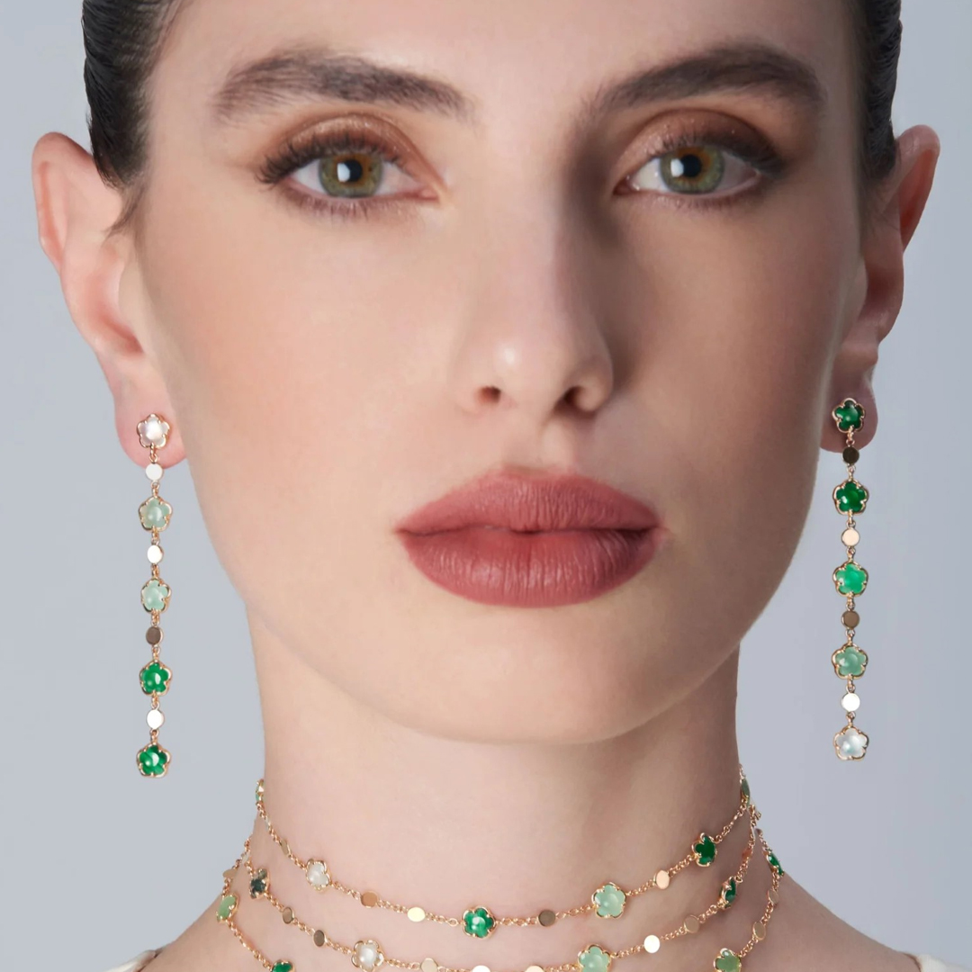 Figlia dei Fiori es un homenaje al espíritu creativo femenino y a la libertad. Figlia dei Fiori celebra la libertad y el amor por la naturaleza. Senderos de flores rodean el cuerpo como planetas. Las mujeres llevan consigo el Universo entero en el corazón de la Madre Naturaleza. En los tonos oro rosa encontramos los colores de la tierra y su calidez.