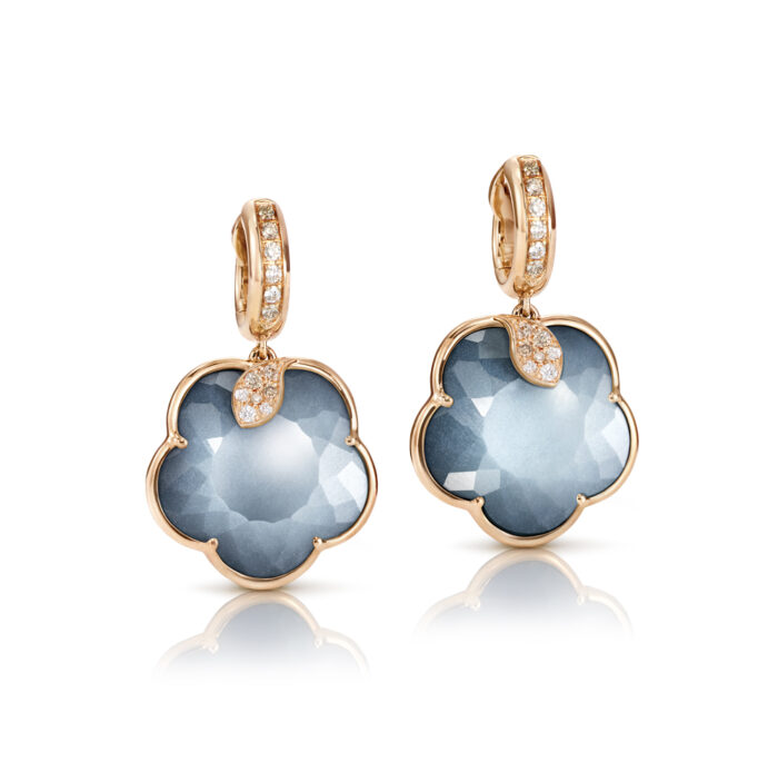 Pendientes de la colección Ton Joli, mantienen la delicada faceta del taglio Bon Ton, un corte exclusivo patentado de Pasquale Bruni. La colección reinterpreta la icónica flor de cinco pétalos de la Maison en nuevas proporciones sofisticadas. Las gemas se mezclan en una flor de oro rosa, envuelta en una hoja de diamantes blancos y champán.