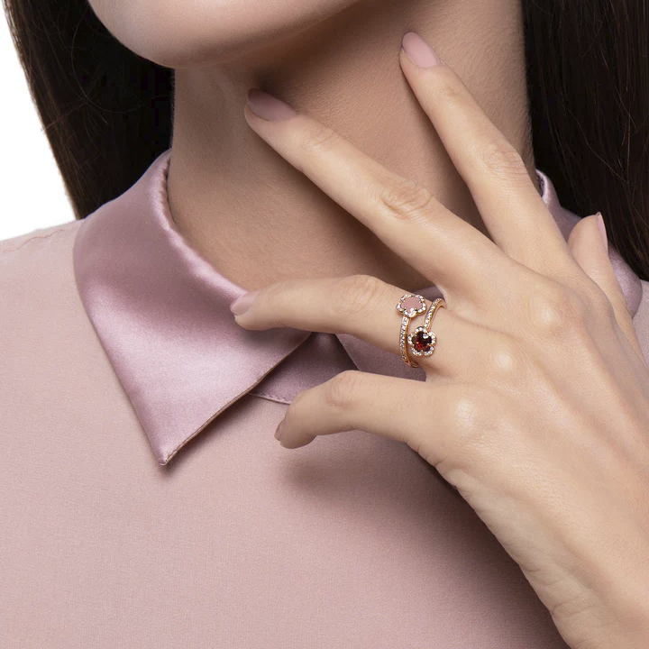 Este anillo en forma de flor de la colección Figlia dei Fiori en oro rosa de 18 quilates con diamantes, granate rojo y calcedonia rosa es una joya única. Figlia dei Fiori celebra la libertad y el amor por la naturaleza. Las estelas de flores rodean el cuerpo como planetas. Las mujeres llevan todo el Universo con ellas en el corazón de la Madre Naturaleza.