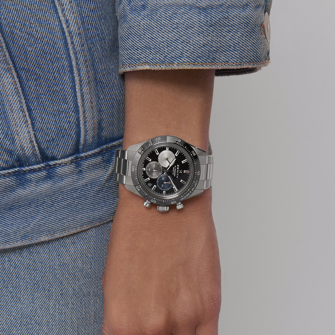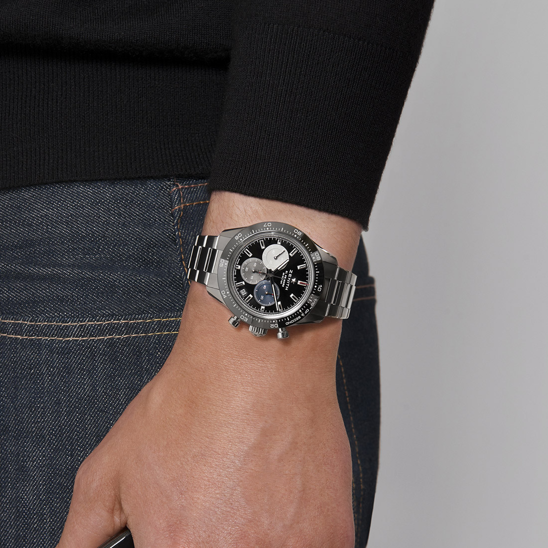 El CHRONOMASTER Sport combina elementos de referencias precedentes de cronógrafos ZENITH, como la esfera tricolor, los pulsadores tipo bomba y el brazalete de acero con bisel de cerámica negro, todo ello en una moderna caja de 41 mm. Esta versión presenta una esfera negra que se combina con un brazalete de acero integrado. Está equipado con el movimiento de cronógrafo automático El Primero 3600 con indicación de las décimas de segundo.