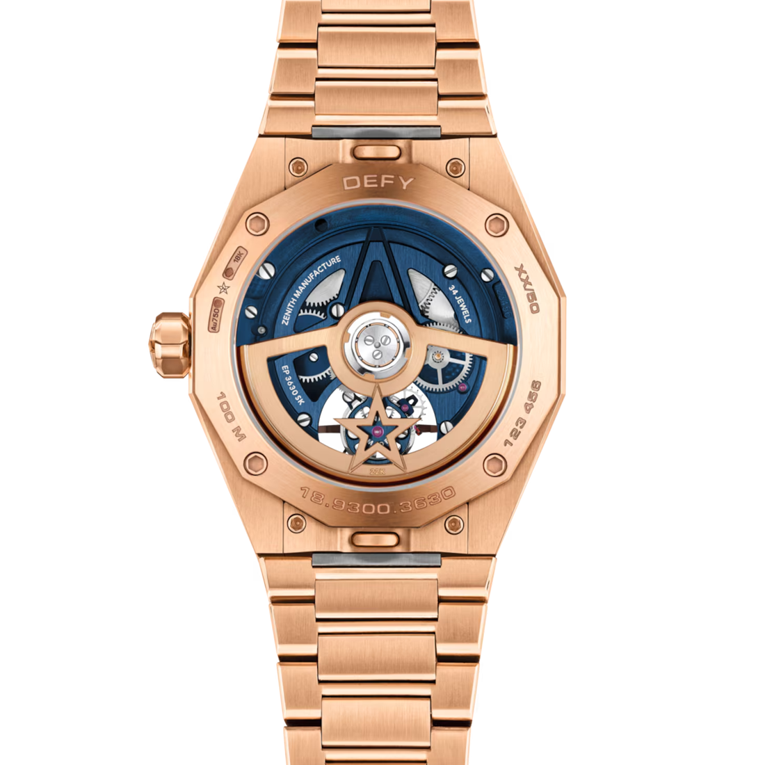 ZENITH presenta el primer DEFY Skyline Tourbillon Skeleton, un reloj definido por una arquitectura audaz, una transparencia innovadora y un equilibrio mecánico. El movimiento El Primero calado de color azul intenso está suspendido en una radiante caja de oro rosa cuya silueta angular capta la luz con cada movimiento de la muñeca. Por su parte, la rotación de alta frecuencia del tourbillon evoca una ciudad llena de energía. Fiel al carácter de esta línea, el movimiento esqueleto se construye como un horizonte mecánico, donde la precisión transparente se fusiona con el diseño urbano. Gracias al sistema de correas intercambiables, el brazalete de oro rosa se puede alternar con la correa de caucho azul para una mayor adaptabilidad.